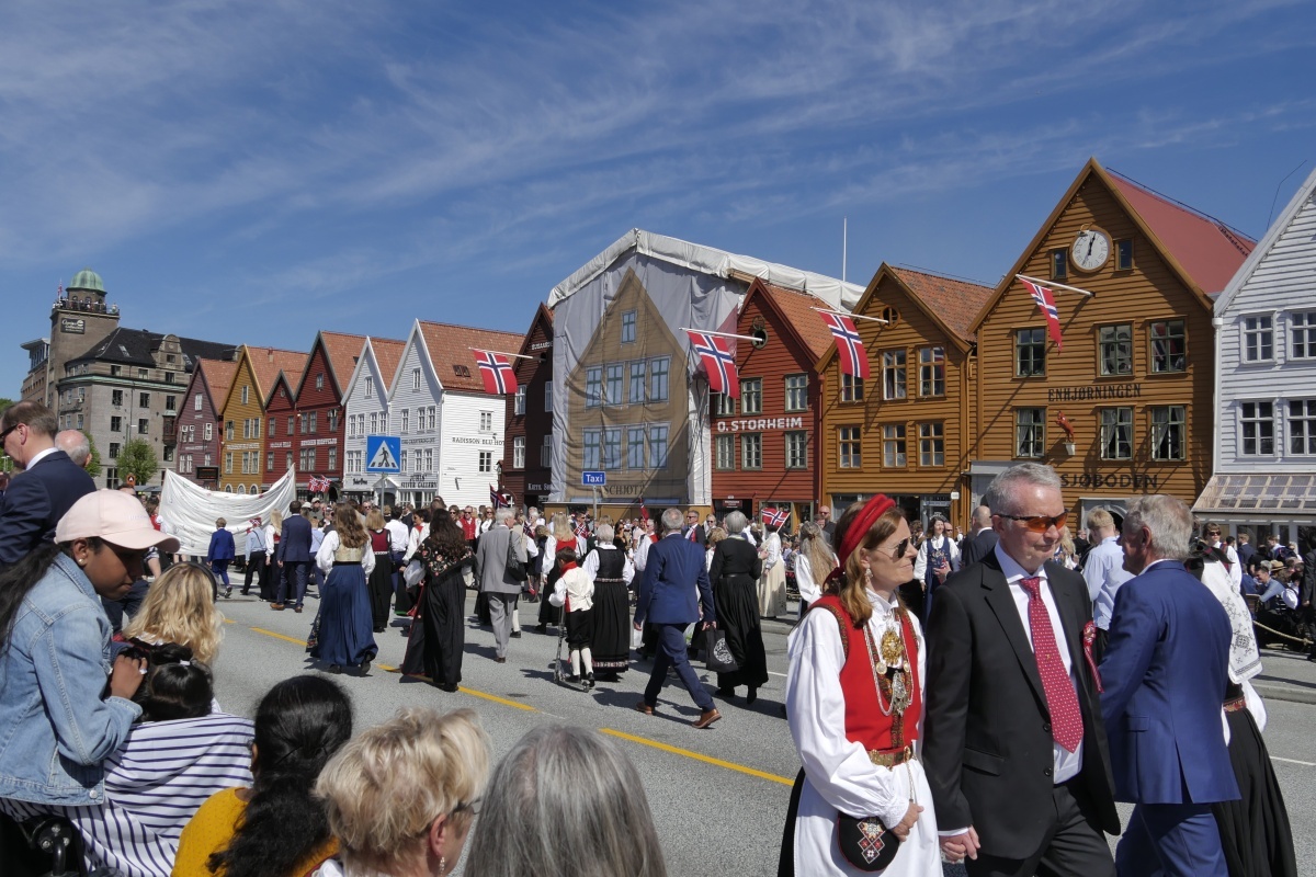 Men det som var egentlig det mest imponerende vi opplevde i Bergen var Grunnlovsdagen. Under planleggingen vår hadde vi ikke tenkt så mye på andre ting som ville være på datoene. Altså planla vi å dra fra Bergen til neste oppholdet på 17. mai. Som alle som kjenner Norge en liten stykke vet, er 17. mai Norges nasjonaldag. Verten vår i Bergen var helt indignert over at vi skulle sitte i en bil på denne høytidsdagen. I alle fall fikk vi tid til å besøke festen i bysentrumet i Bergen før vi dro. Og jeg må si som en tysker at det var mer enn jeg noensinne hadde sett før. Nasjonaldagen i Tyskland, den 3. oktober, eller dagen for tysk enhet, er heller kjedelig i forhold til Norges 17. mai. Overalt vi så norske flagg, kvinner i bunader, menn i dresser. Det var en hyggelig parade langs Bryggen. Og selv om vi bare fikk et lite glimt av hele festen, så var det jo helt utrolig og meget spennende. Jeg må takke Norge bare for dette inntrykket. Det gjorde hele turen så mye mer iørefallende.
