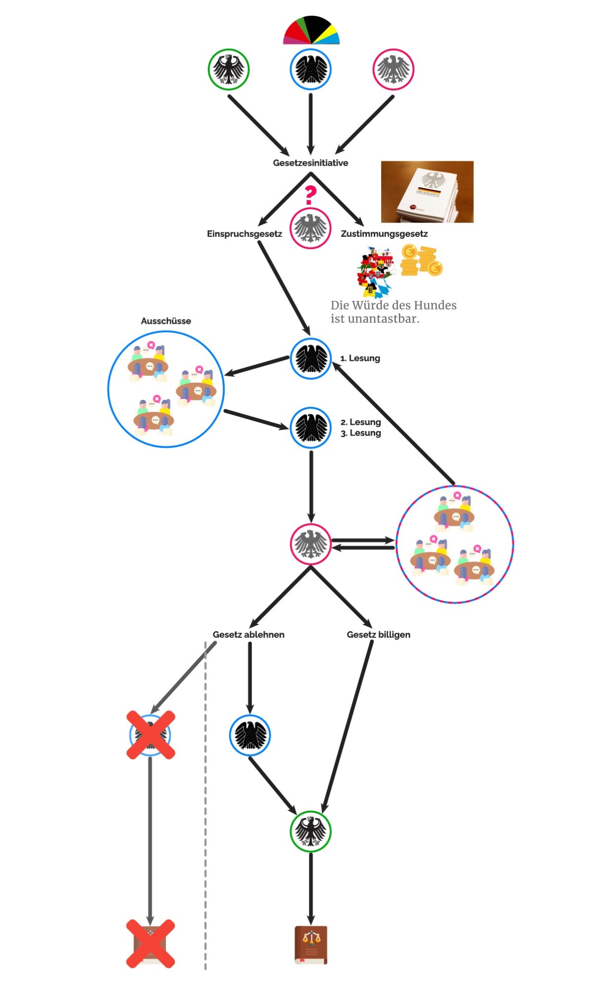 Unser Gesetz ist der Einfachheit halber ein Einspruchsgesetz. Zuerst wird der Gesetzesentwurf an den Bundestag weitergeleitet. Dort findet dann die erste von drei Lesungen statt. Nach der ersten Lesung wird das Gesetz an einen oder mehrere sogenannte Ausschüsse weitergegeben. Ein Ausschuss bezeichnet eine Gruppe von Bundestagsabgeordneten, die sich mit einem bestimmten Thema beschäftigen. Die Ausschüsse sollen den Gesetzesentwurf bereit zur Abstimmung machen, da nicht jeder einzelne Punkt detailliert von den mehr als 598 Abgeordneten verhandelt werden kann.