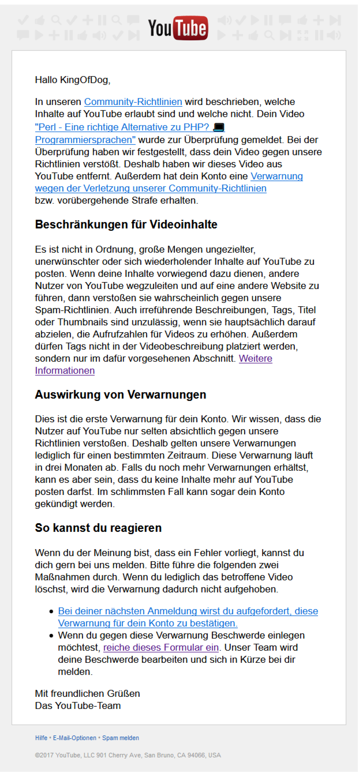 Ich habe für ein Video über die Programmiersprache "Perl", das aus meiner Sicht der Dinge und aus der von einigen Freunden und Bekannten, gegen keinerlei YouTube-Community-Richtlinie oder Gesetz verstößt, eine Verwarnung auf meinem Kanal erhalten. Damit habe ich nun keine Möglichkeit mehr, mit meinem YouTube-Kanal Livestreams zu veranstalten. Völlig unverständlich für mich als YouTuber. Es gibt keinerlei genaue Angabe, was genau mit dem Video nicht in Ordnung ist oder was gegen die Richtlinien verstoßen haben soll. Aber trotzdem musste ich beim nächsten Login die Beschwerde bestätigen, um mein Konto weiter regulär zum Videoschauen nutzen zu können - auch wenn ich ganz und gar nicht mit dem Verstoß einverstanden war und immer noch nicht bin. Mir bleibt lediglich die Möglichkeit, Beschwerde einzulegen und - abzuwarten. Bis das YouTube-Team auf meine Beschwerde reagiert. Was ich natürlich auch bereits getan habe.